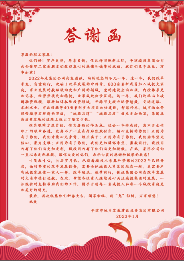 為感謝職工及職工家屬一年來(lái)的辛勤付出,架起公司與職工家屬溝通的橋梁,讓職工家屬更全面、深入地了解職工工作情況,更好地支持職工的工作,1月16日,平?jīng)龀峭都瘓F(tuán)召開(kāi)2022年度職工家屬答謝會(huì)。公司中層管理人員、掛職干部、2022年度“城投標(biāo)兵”、先進(jìn)個(gè)人及一線(xiàn)職工等40余名職工家屬代表齊聚一堂,共話(huà)公司發(fā)展和職工個(gè)人成長(zhǎng)。 答謝會(huì)上,集團(tuán)公司向職工家屬發(fā)放了答謝卡,觀(guān)看了2022年度經(jīng)營(yíng)發(fā)展綜述展示片,集團(tuán)公司總經(jīng)理介紹了公司2022年度取得的業(yè)績(jī)及2023年工作計(jì)劃,集團(tuán)公司黨委主要領(lǐng)導(dǎo)從企業(yè)發(fā)展成就、隊(duì)伍建設(shè)、人文關(guān)懷等方面做了補(bǔ)充介紹,向所有家屬表達(dá)了感謝之意并致以節(jié)日的祝福,與家屬親切交談。9名職工家屬代表作了發(fā)言,充分表達(dá)了對(duì)公司的美好祝愿,大家紛紛表示將一如既往地關(guān)心公司發(fā)展,全力支持職工放手工作,堅(jiān)決守好職工的“大后方”?,F(xiàn)場(chǎng)氣氛溫馨而友好,處處洋溢著歡聲笑語(yǔ)。