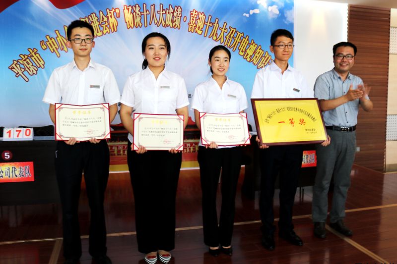 競賽結(jié)束后,伴隨著歡快的音樂聲,市委宣傳部副部長雷勇走上臺,為全市暢談十八大·喜迎十九大電視知識競賽中省駐平及市屬企業(yè)賽區(qū)第一名——平?jīng)鍪谢菝窆敬黻?duì)頒發(fā)一等獎(jiǎng)獎(jiǎng)牌和證書。