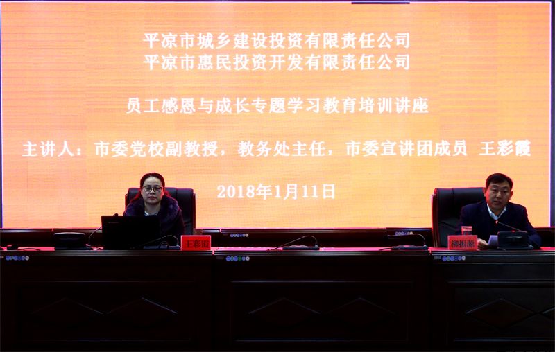 1月11日上午,惠民公司舉辦員工“感恩與成長”專題學習教育培訓講座,本次培訓特邀中共平涼市委黨校副教授、教務處主任、市委宣講團成員王彩霞教授主講。公司副總經理魏顯文、馬新平出席培訓講座,副總經理柳振源主持培訓講座,公司中層以上管理干部及員工140余人參加培訓。