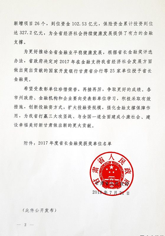 7月23日,省委、省政府召開全省金融工作會議,對2017年支持我省經(jīng)濟發(fā)展貢獻突出的單位授予省長金融獎,平?jīng)鍪谐青l(xiāng)建設(shè)投資有限責(zé)任公司榮獲該獎項,這是平?jīng)鍪?017年度唯一一家獲此殊榮的單位。