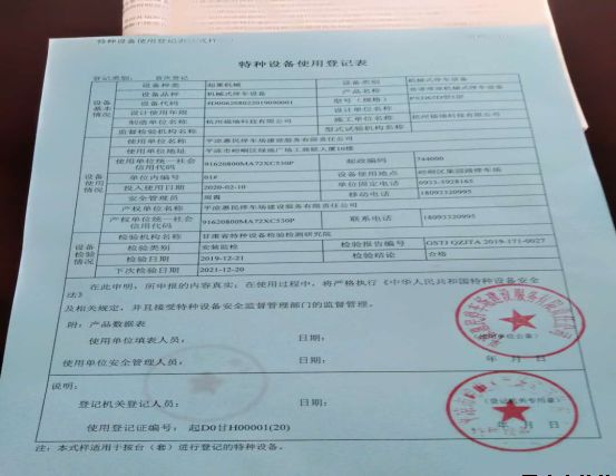 為保證果園路立體停車(chē)庫(kù)安全運(yùn)營(yíng),2019年12月15日設(shè)備安裝廠(chǎng)家委托甘肅省特種設(shè)備檢驗(yàn)檢測(cè)研究院對(duì)果園路立體停車(chē)庫(kù)設(shè)備進(jìn)行了現(xiàn)場(chǎng)檢驗(yàn),于2019年12月21日出具了檢驗(yàn)報(bào)告。按照特種設(shè)備管理辦法的要求,停車(chē)場(chǎng)公司積極銜接崆峒區(qū)質(zhì)量監(jiān)督局,提交了辦理特種設(shè)備使用登記證所需的各種資料及證明文件,2020年3月5日順利取得果園路立體停車(chē)庫(kù)特種設(shè)備使用登記證。