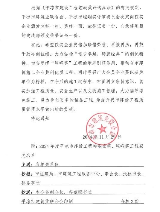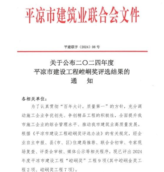 平?jīng)鍪薪ㄖこ?/span>“崆峒獎”作為平?jīng)鍪薪ㄔO(shè)工程質(zhì)量最高榮譽,評選標(biāo)準(zhǔn)高,質(zhì)量要求嚴(yán),經(jīng)過縣(市、區(qū))住建局推薦、聯(lián)合會初審、專家現(xiàn)場復(fù)查、評委會審核、媒體公示等相關(guān)程序逐級評選。