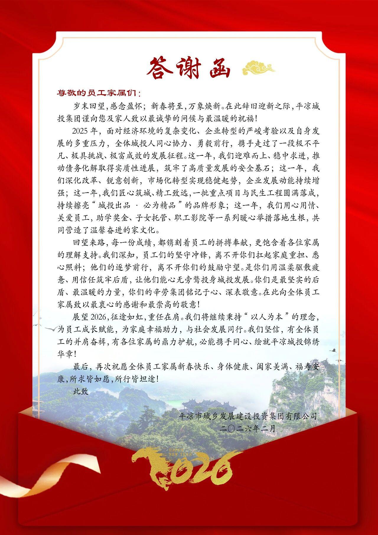 會(huì)上,集團(tuán)公司向職工家屬代表們送上答謝函。集團(tuán)公司黨委主要領(lǐng)導(dǎo)向職工家屬代表們?nèi)娼榻B了過(guò)去一年集團(tuán)公司改革發(fā)展成就和2026年發(fā)展思路、重點(diǎn),并與他們親切交談,向他們送去衷心的感謝和新春的祝福。參會(huì)家屬代表們對(duì)集團(tuán)公司在平?jīng)龀鞘薪ㄔO(shè)、民生改善等方面作出的卓越貢獻(xiàn)給予高度評(píng)價(jià),表達(dá)了對(duì)集團(tuán)的美好祝愿,并表示將一如既往地做職工最堅(jiān)實(shí)的后盾,主動(dòng)分擔(dān)家庭責(zé)任,讓親人能卸下后顧之憂,全身心投入工作,為集團(tuán)公司改革發(fā)展貢獻(xiàn)更多的力量。