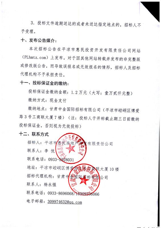 2.投標(biāo)文件遞交地點(diǎn)為:平?jīng)鍪谢菝穹康禺a(chǎn)開(kāi)發(fā)有限責(zé)任公司會(huì)議室(平?jīng)鍪嗅轻紖^(qū)博愛(ài)路3號(hào)工商聯(lián)大廈11樓)。