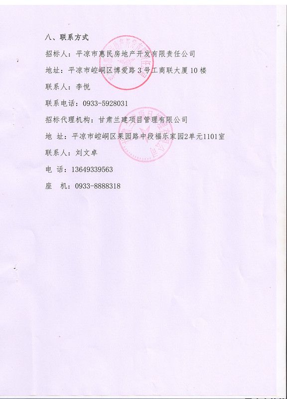 2.投標(biāo)文件遞交地點(diǎn)為:平?jīng)鍪谢菝穹康禺a(chǎn)開發(fā)有限責(zé)任公司會(huì)議室(平?jīng)鍪嗅轻紖^(qū)博愛路3號(hào)工商聯(lián)大廈11樓)。