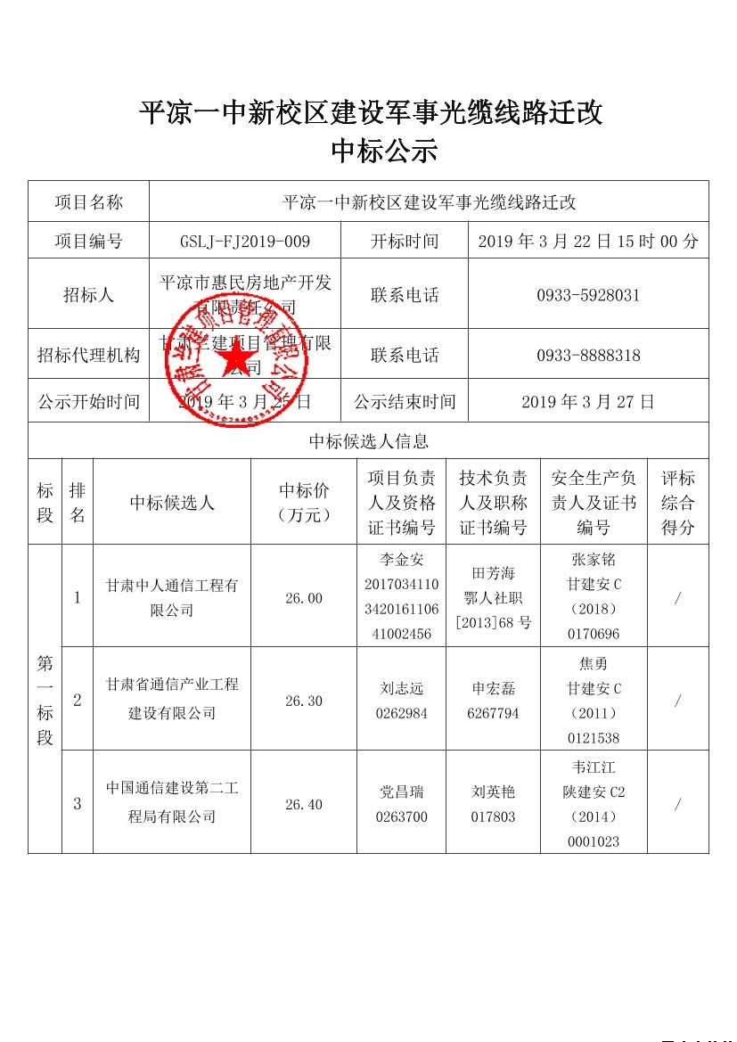 平?jīng)鲆恢行滦^(qū)建設軍事光纜線路遷改中標公示