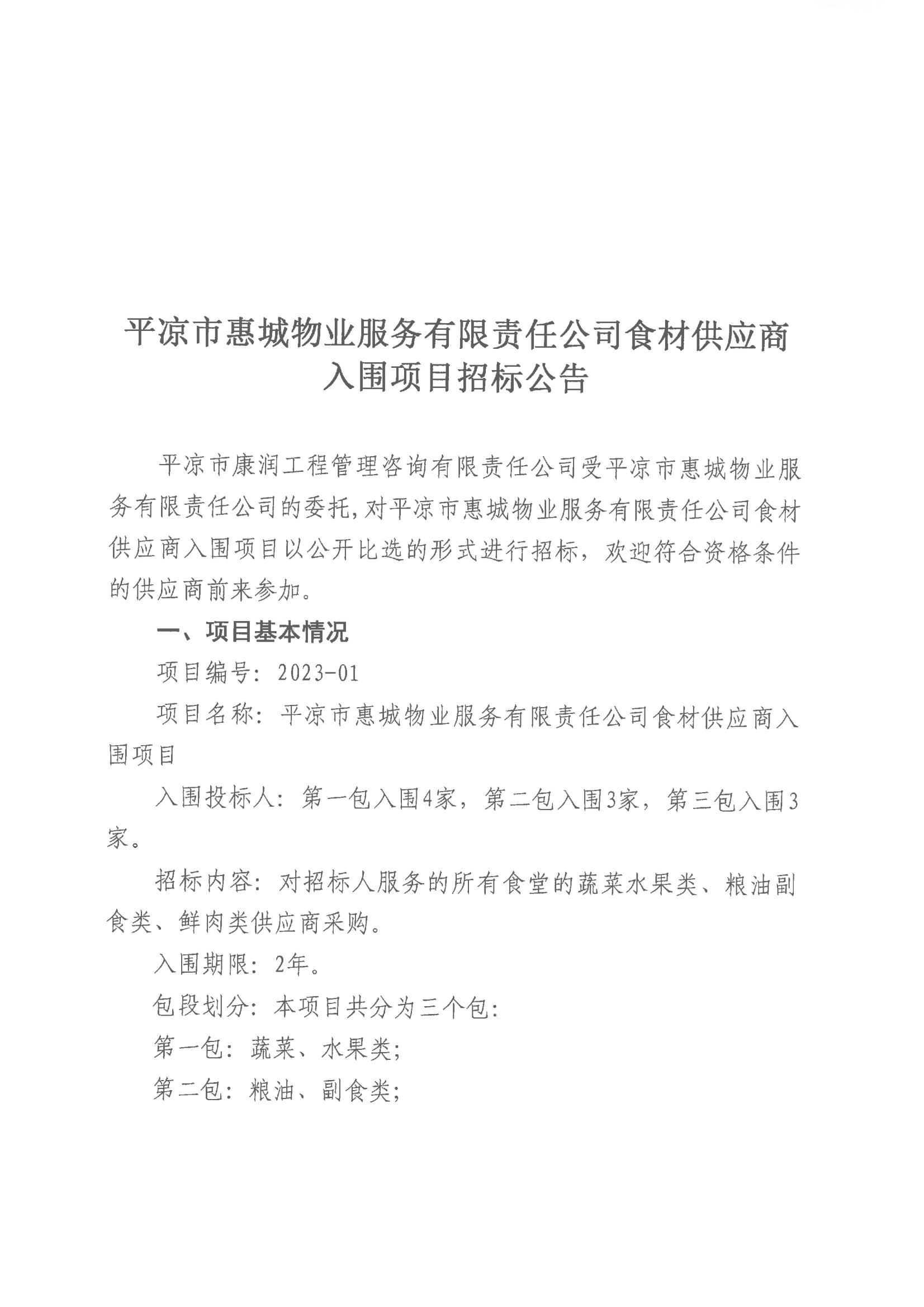 平?jīng)鍪谢莩俏飿I(yè)服務(wù)有限責(zé)任公司食材供應(yīng)商入圍項(xiàng)目招標(biāo)公告