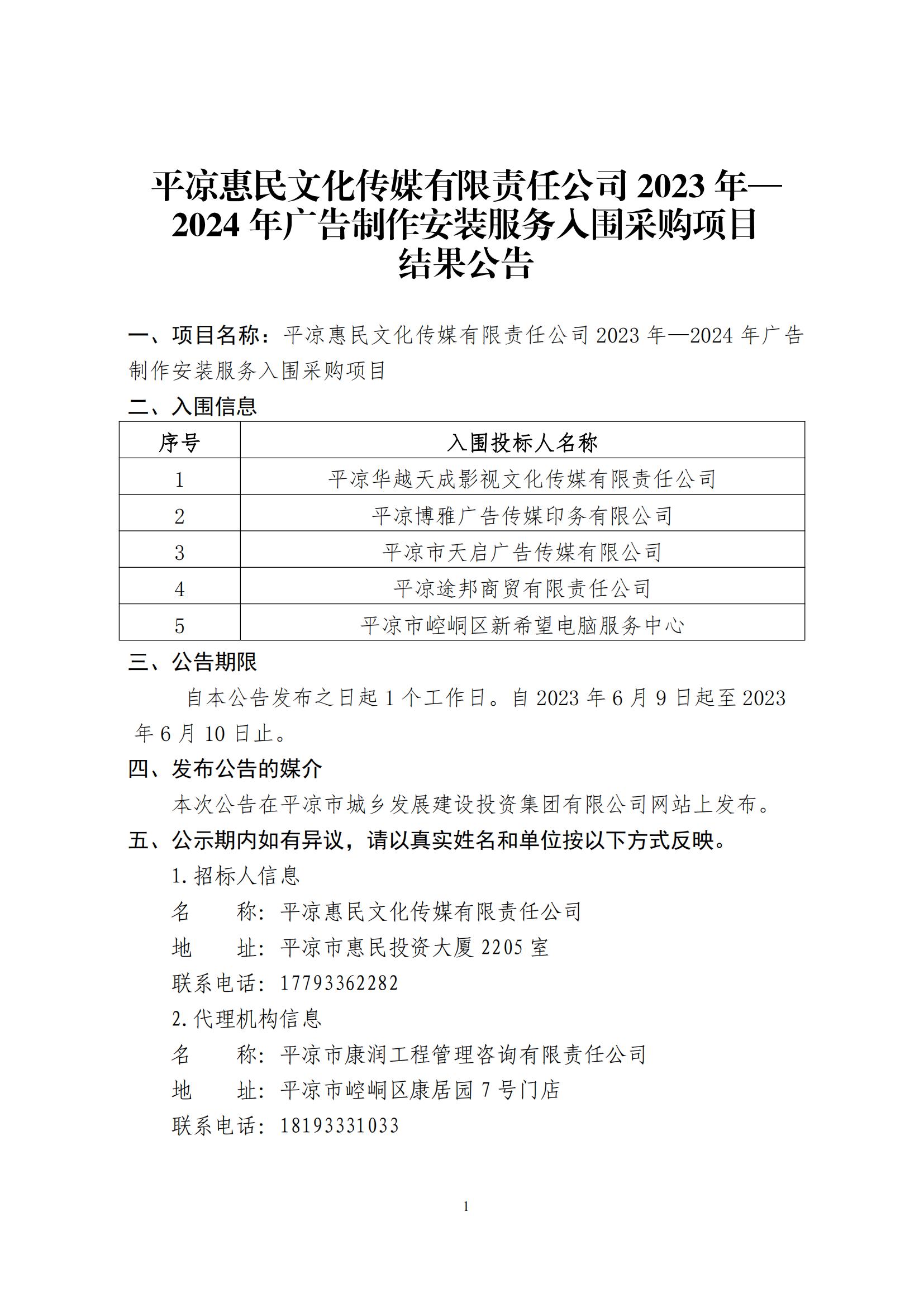 平?jīng)龌菝裎幕瘋髅接邢挢熑喂?023年—2024年廣告制作安裝服務入圍采購項目結果公告