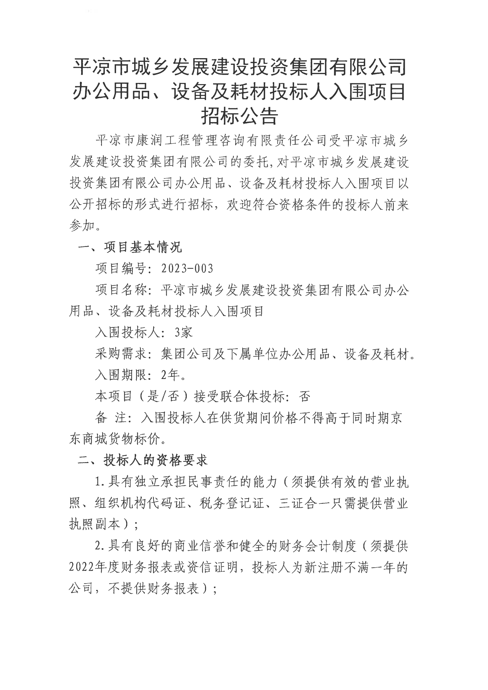 辦公用品、設(shè)備及耗材投標(biāo)人入圍項(xiàng)目招標(biāo)公告